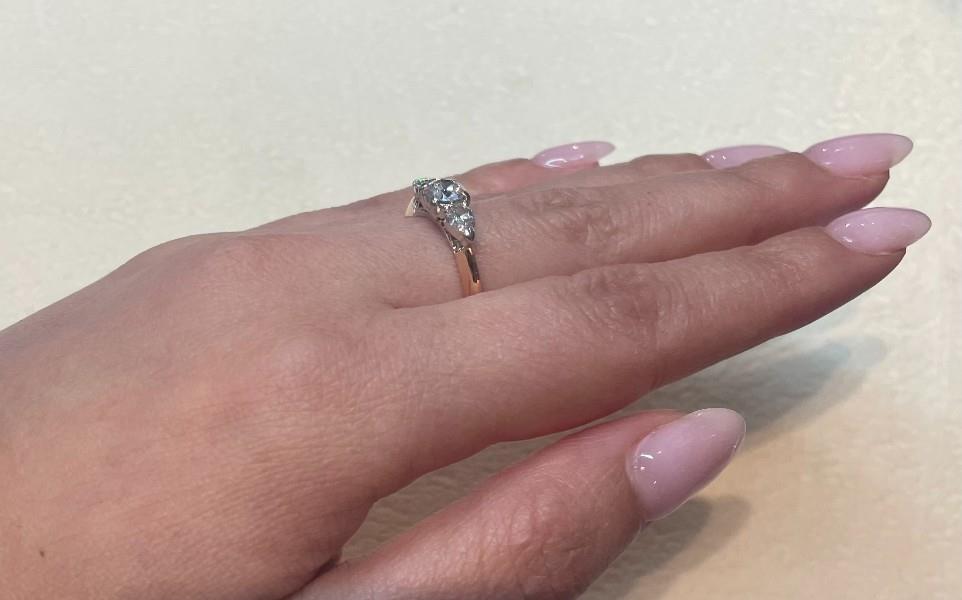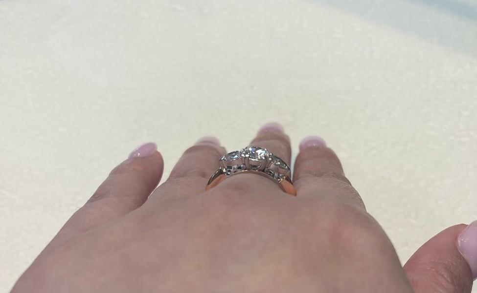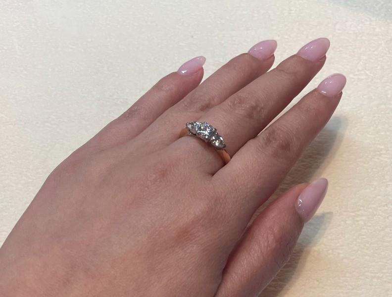 AN 18CT ROSE & WHITE GOLD THREE STONE BRILLIANT (.50ct) & PEAR CUT DIAMOND RING, TOTAL WEIGHT 4GRAMS