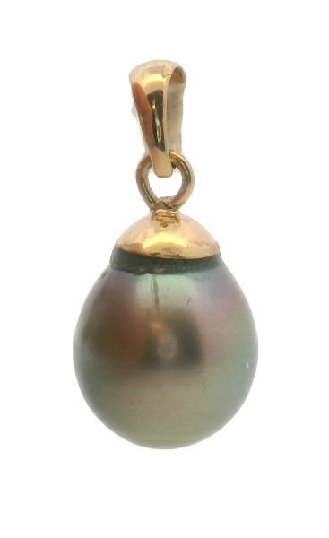 18ct yellow gold, featuring a pear shape South Sea Tahitian Pearl, light grey body colour with overtones of purple, yellow and green, measuring 14mm at the widest point, fine lustre, half drilled and capped, smooth polished fittings, tapered bail. Height including bail: 2.5cm. Total Weight: 3.7g