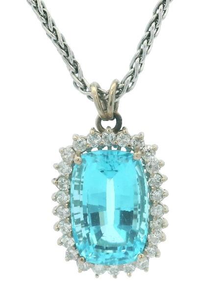 AN 18CT WHITE GOLD CUSHION CUT BLUE TOPAZ 16.0 CTS & DIAMOND 1.26CTS CLUSTER PENDANT, 20.4GRAMS