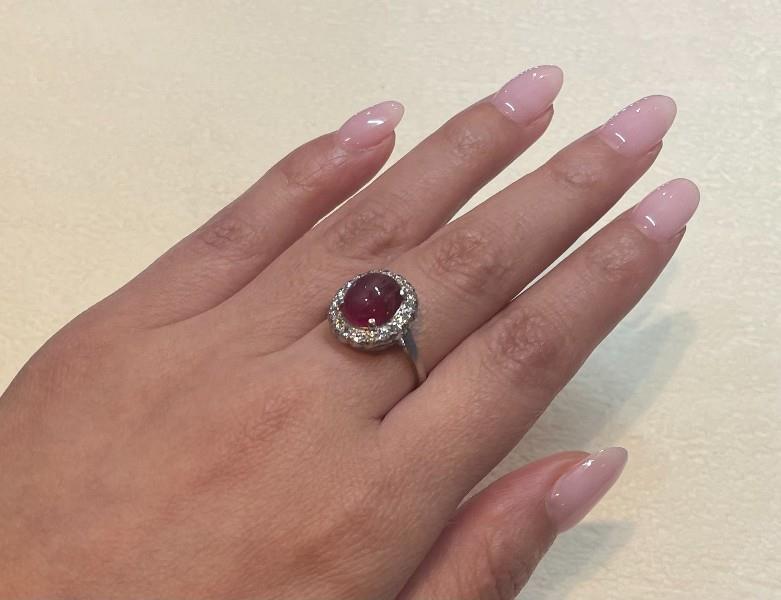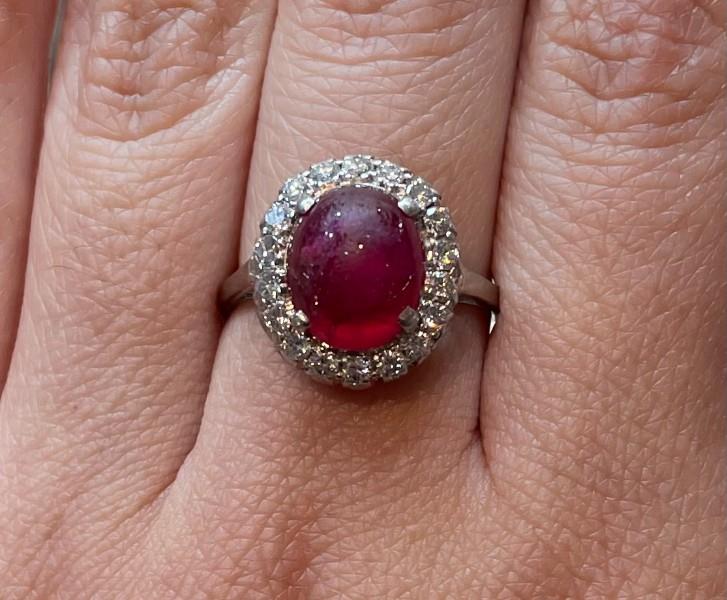 AN 18K W.G & PLAT. CABOCHON RUBY & DIAMOND CLUSTER RING HARDY BROTHERS, SIZE: L3/4, T.W.: 4.3GRAMS