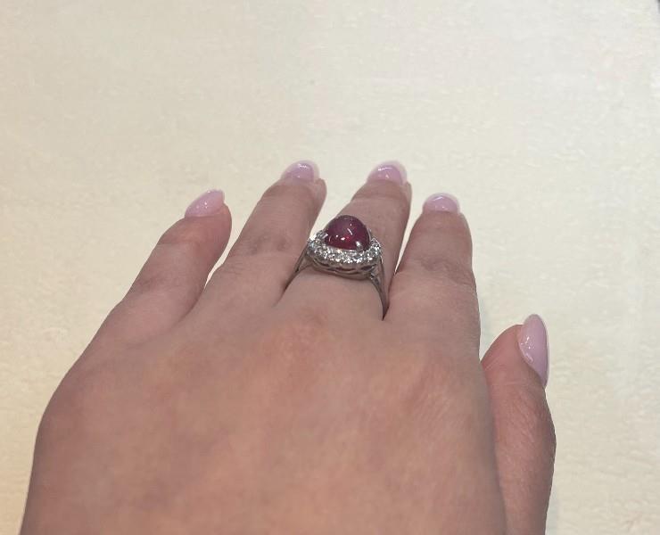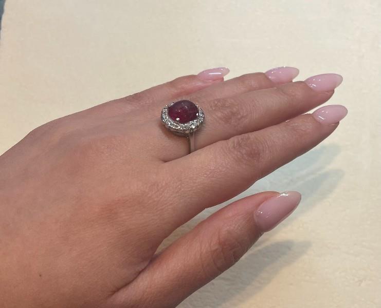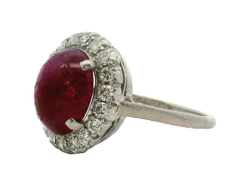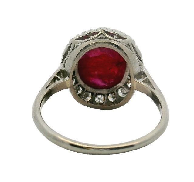 18ct white gold and platinum, hallmarked H.Bros, classic and oval in shape, featuring a central oval cabochon ruby of deep raspberry red colour, measuring 10 x 8.4mm, heavily abraided, claw set in four bead claws, surrounded by smaller brilliant cut diamonds, each of approximately 0.02ct, totalling approximately 0.36ct, finished to fine band. Ring Size L3/4. N.B. central ruby as found.