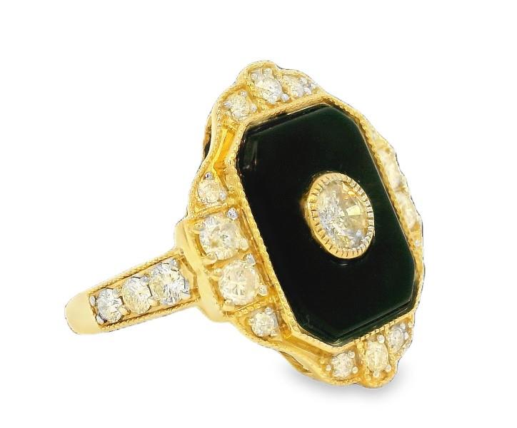 A 14K Y.G UNISEX ART DECO INSPIRED ONYX 3.02 & DIAMOND .84CT SET PLAQUE RING, SIZE: O, T.W.: 6.1GRAM