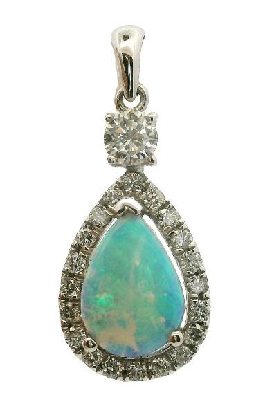 18ct white gold, featuring a pear shape cabochon, totalling 1.18ct, jelly body colour with flashing play of colours displaying purple and greens, claw set, closed back, surrounded by a halo of round brilliant cut Diamonds and detailed above by a larger round brilliant cut Diamonds, claw set, totalling 0.72ct, on polished tapered bail. Height: 2.5cm. Total weight: 3.1g