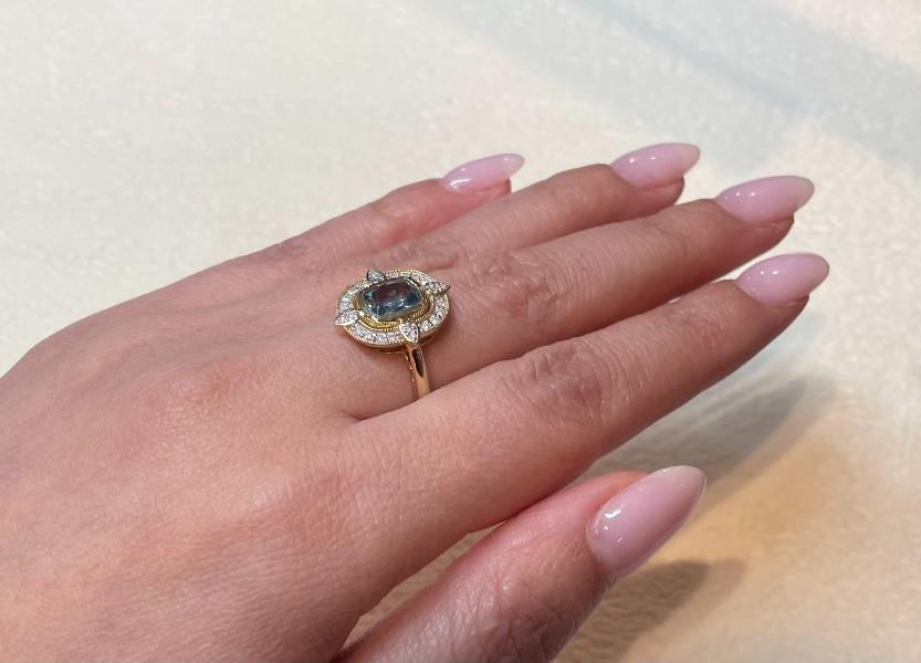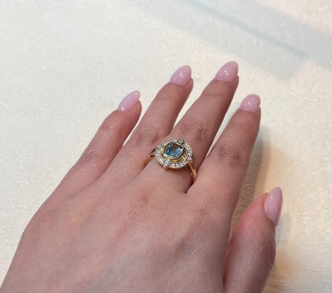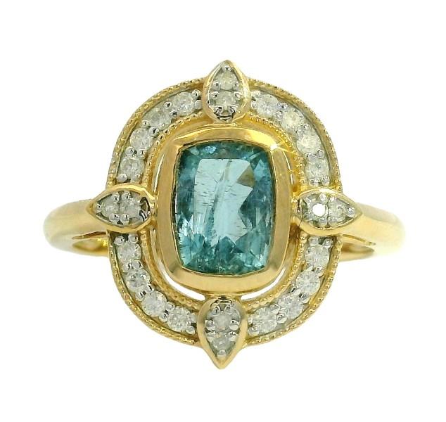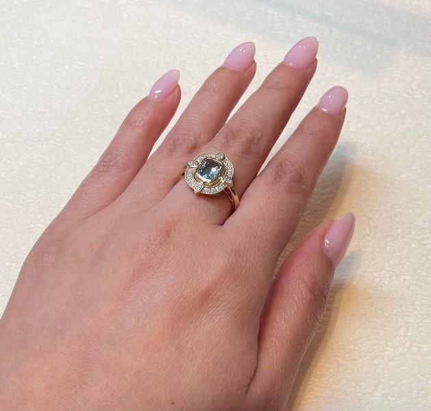 14ct yellow gold, featuring a cushion cut Aquamarine, totalling 0.87ct, bezel set, surrounded by a floating halo of round brilliant cut Diamonds, shared bead set in white gold, lined by millegrain borders, set at ninety degrees cross sections are pear cut Diamonds, bead set in white gold, upswept shoulders merging into a polished half round band. A.T.D.W.: 0.20ct. Ring size: M. Valuation on request. Total weight: 3.2g