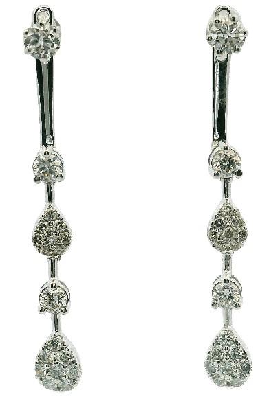 18ct white gold, featuring pear shapes set with round brilliant cut Diamonds, alternating between small sections of semi flexible rod and round brilliant cut Diamonds, claw set, vertical line, merged into a tapered bar with a single round brilliant cut Diamond, removable, pierced through, with options of 3 level of adjustments and or worn as solitaire studs. A.T.D.W.: 0.70ct. Height of earrings: 3.8cm. Total weight: 2.9g