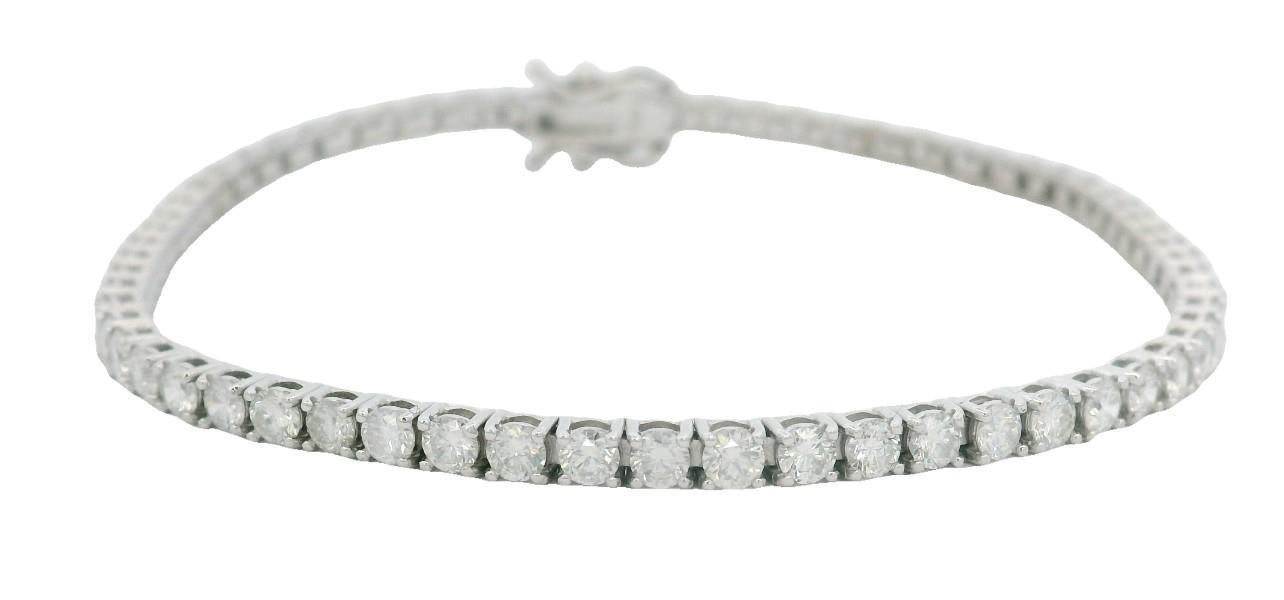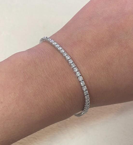 18ct white gold, featuring sixty-three round brilliant cut Diamonds, totalling 4.02ct, bead claw set, connected through the base in a semi-flexible bracelet, measuring 18cm in length, complete with a concealed box clasp and secure with double side latches. Valuation on request. Total weight: 7.2g