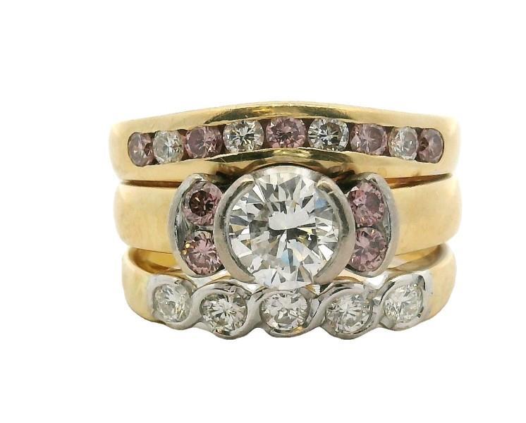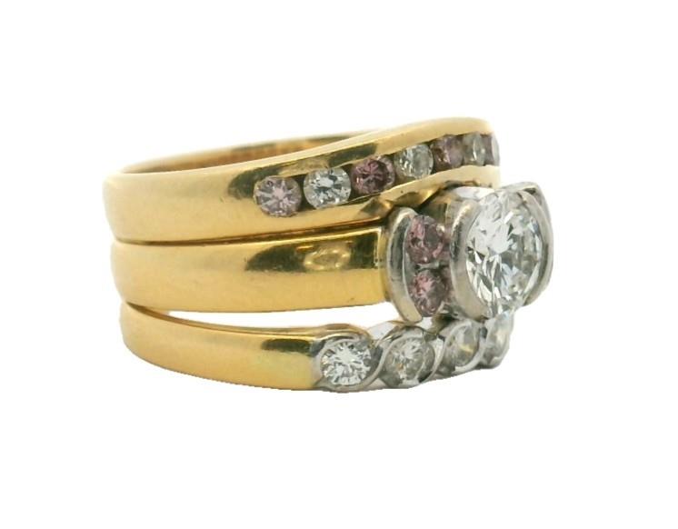 Each ring handcrafted in 18ct yellow and white gold, connected into a single suite, but able to be divided if preferred, the principle ring featuring a central white brilliant cut diamond of 0.70ct in split bezel setting, flanked to each side by natural pink Argyle Mine brilliant cut diamonds, four in total, the second band ring of curved channel set design, alternating between four white brilliant cuts and five pink Argyle diamonds, merging to smooth band, finally the third ring set with five white brilliant cuts in swirled split bezel setting. Pink Diamonds totalling: 4- 0.17ct, 5-0.175ct Valuation on request.