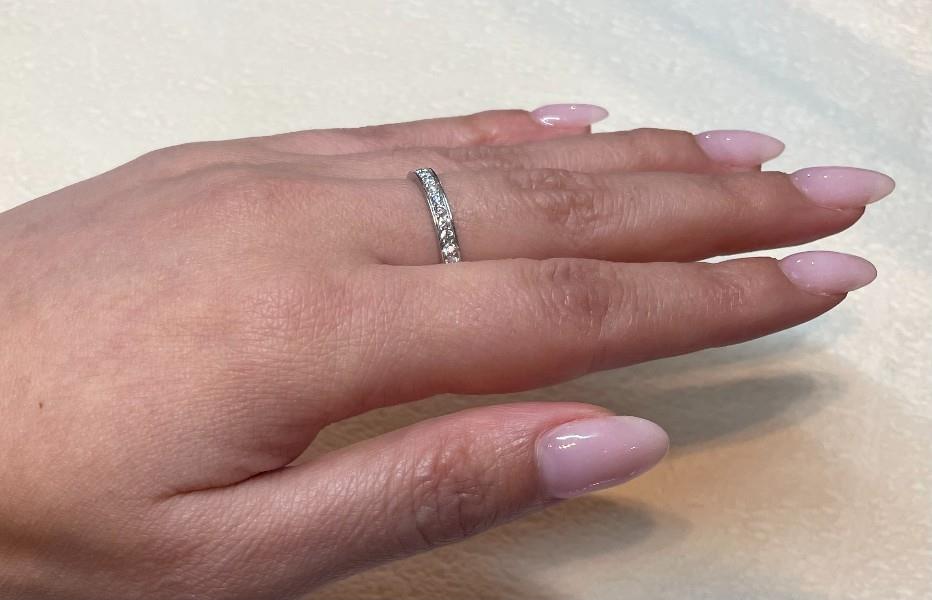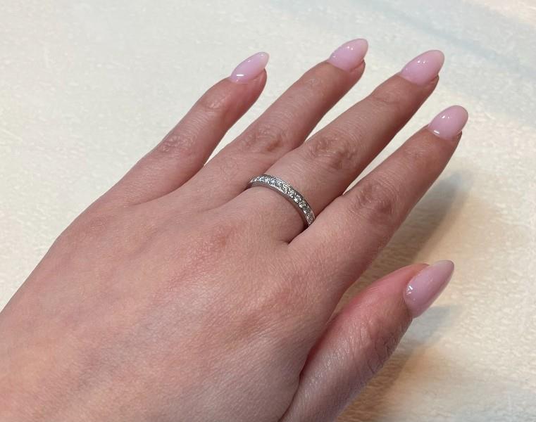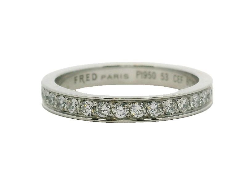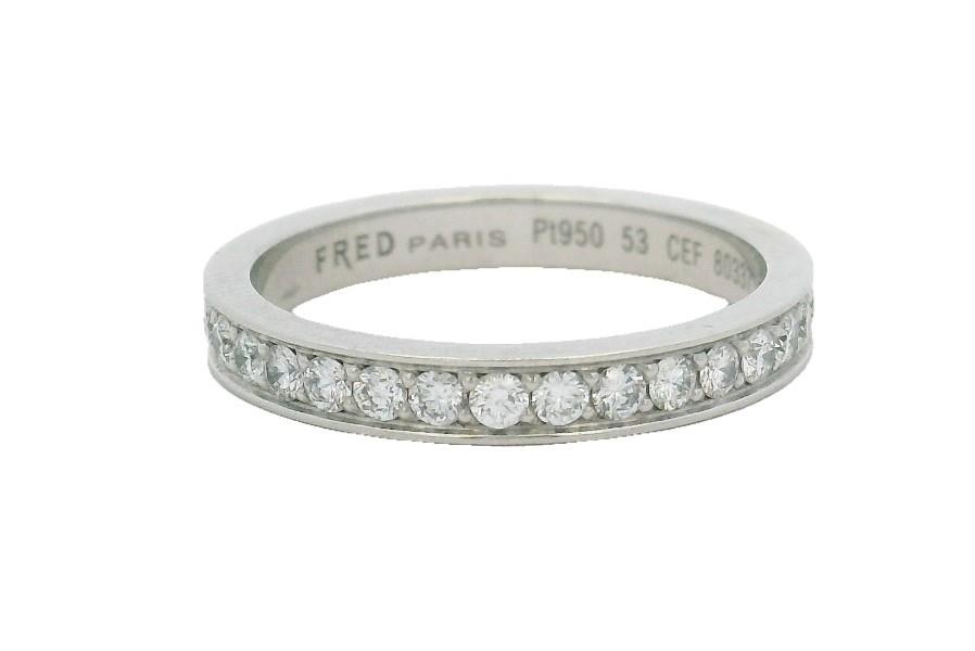 Platinum, fully hallmarked by Fred Paris, size 53, serial number marked, presented as a 2.8mm wide eternity band grain set throughout with uniform sized fine quality brilliant cut diamonds, totalling approximately 0.61ct, closed side rails and fine finish complete. Valuation on request. Ring Size L1/2.