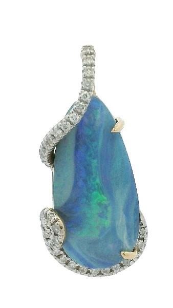 14ct yellow gold and rhodium, featuring a rounded pear shape Boulder Opal, sky blue colour with purple and white swirls with purple and green play of colours, claw set, encompassed by a decorative swirly overlay of round brilliant cut Diamond, making up the bail, totalling 0.15ct, claw set. Height: 2.5cm. Valuation on request. Total weight: 2.1g