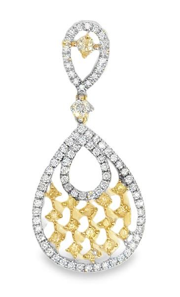 14ct white gold and yellow gold, featuring a frame pear shape within a pear shape lined with round brilliant cut Diamonds, claw set, lined horizontally to the body of the larger pear shape are fancy yellow colour Diamonds, bead set, connected to an articulated yellow Diamond of similar colour, claw set, suspended from a smaller opposing pear shape frame, lined with round brilliant cut Diamonds, decorated with a single yellow Diamond, concealed bail. A.T.D.W.: 1.45ct. Height of pendant with bail: 4.3cm. Valuation on request. Total weight: 2.9g