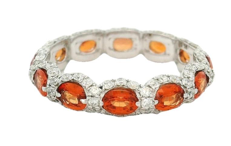 18ct white gold, featuring twelve oval side set Sapphires, fancy orange tones, totalling 2.77ct, bead set, each surrounded by connecting halo, rounded in profile, making up the whole band, pave set with round brilliant cut Diamonds, totalling 1.02ct, smooth underside, open back, scallop edge band. Ring size: N. Total Weight: 3.4g