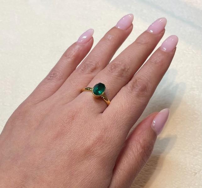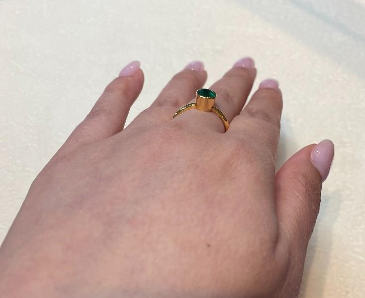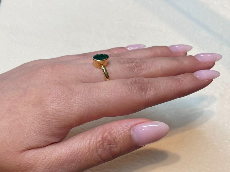 18ct yellow gold, stamped, of solitaire style, featuring a central oval bezel set deep strong green emerald of approximately 1.28ct, smooth polished mount, completed with low domed 2.3mm wide band. Ring Size P.