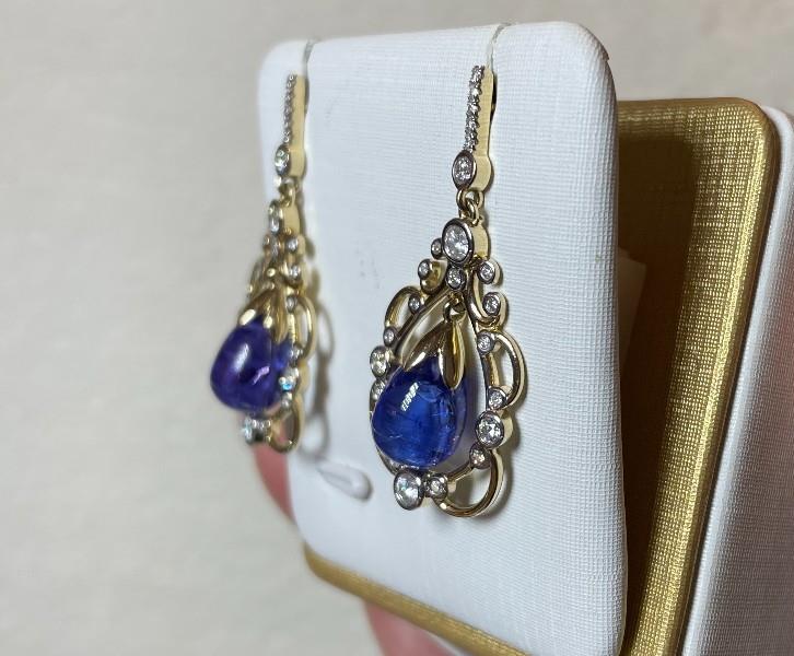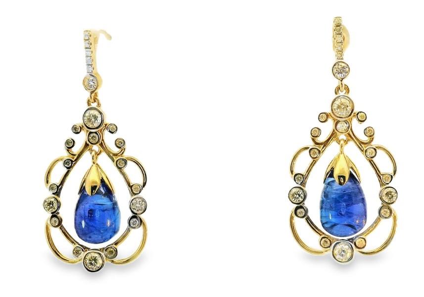 14ct yellow gold, featuring two pear shape Tanzanite drops, totalling 9.11ct, translucent medium to dark blue, eggplant claw cap, articulated at the centre of a floating filigree design halo, decorated by forty-six round brilliant cut Diamonds of varying sizes, bezel set in white gold, articulated from a Diamond detailed rod, on pierced post with butterfly backs. A.T.D.W.: 0.61ct. Height: 3.6cm. Valuation on request. Total weight: 6.8g
