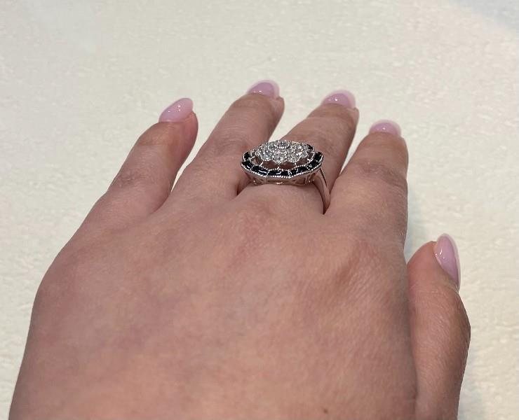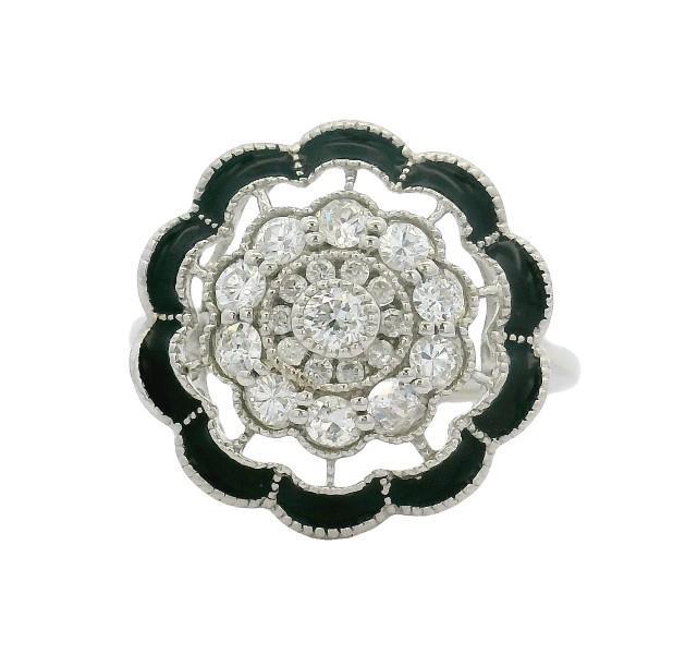 14ct white gold, featuring twenty round brilliant Diamond, totalling 0.49ct, of multiple sizes, arranged as a floral cluster in the centre, surrounded by a black enamel halo with a top scallop formation, pierced scallop sides, upswept shoulders, merging into a simple polished band. Ring size: L1/2. Valuation on request. Total weight: 2.9g
