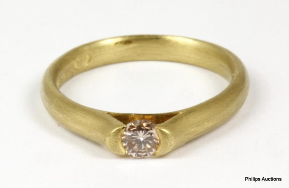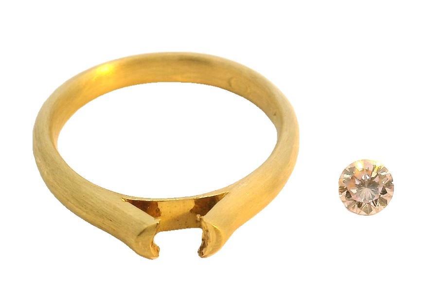 18ct yellow gold, handcrafted by jeweller Chris Bailey WA Australia, featuring a single brilliant cut pink Argyle diamond of 0.24ct, accompanied by lab certification, split bezel set, merging to a smooth scalloped mount. Ring Size L:. N.B. currently diamond has been unset for purpose of authenticating. Valuation on request. Authenticity Certificate Available.