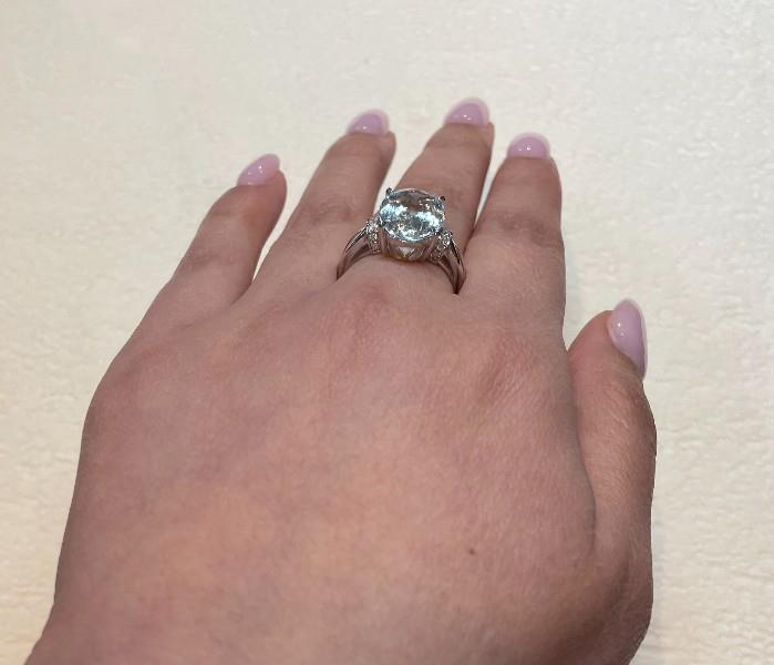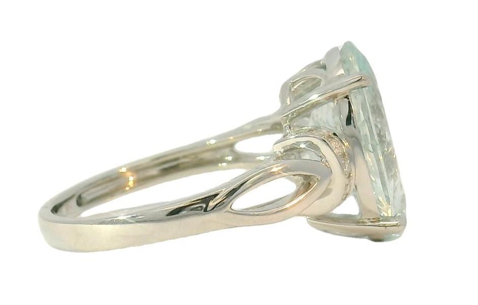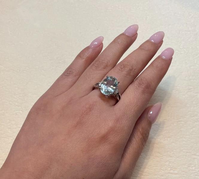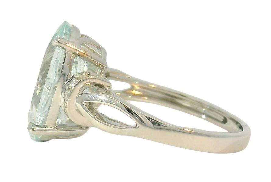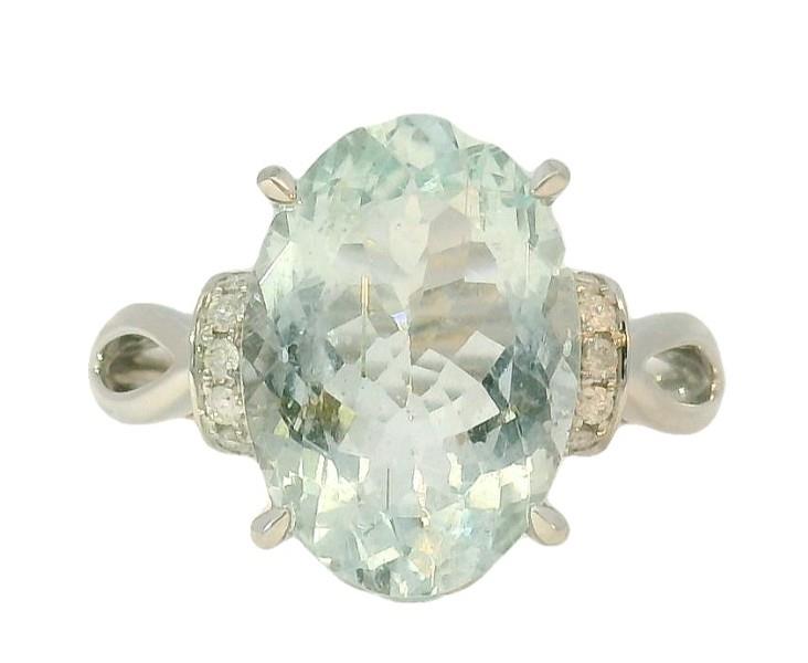 14ct white gold, featuring an oval cut Aquamarine, totalling 4.86ct, claw set, decorative basket, open back, flanked by half hoops rondelles, set with round brilliant cut Diamonds, totalling fourteen with a combined weight of 0.11ct, open marquise shape shoulders, merging into a modern square band ring. Ring size: O, Valuation on request. Total Weight: 4.0g
