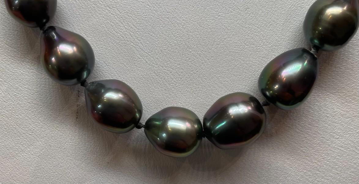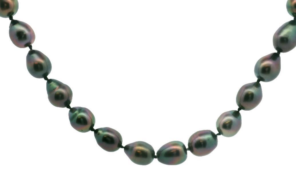 18ct yellow gold, featuring thirty-five baroque Tahitian South Sea Pearls, medium to light body colour with overtones of purple, orange, yellow and green, fine lustre, knotted throughout in same colour thread, measuring 48cm in length, tablet shape box clasp with chrome finishes, curve groove detailing. Total Weight: 52.2g