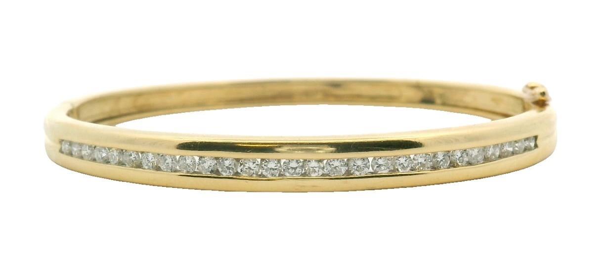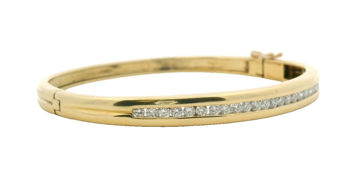 18ct yellow gold, stamped 18 750, of oval hinged form, channel set across top with uniform sized brilliant cut diamonds, each of approximately 0.02ct, totalling approximately 0.54ct, edged in closed gold sides, fitted with hinged clasp, ribbed to gold section at reverse. Inner Width: 5.4cms