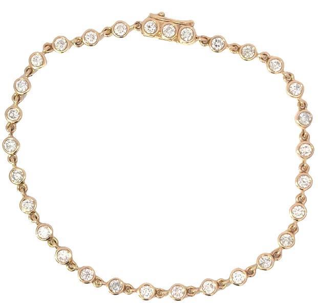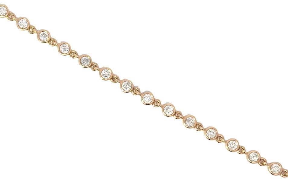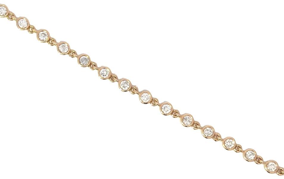 14ct yellow gold, featuring thirty round brilliant cut Diamonds, totalling 2.00ct, bezel set, connected through individual side links in an articulated bracelet measuring 18cms long, complete with a concealed box clasp with side latch. Valuation on request. Total Weight: 6.5g