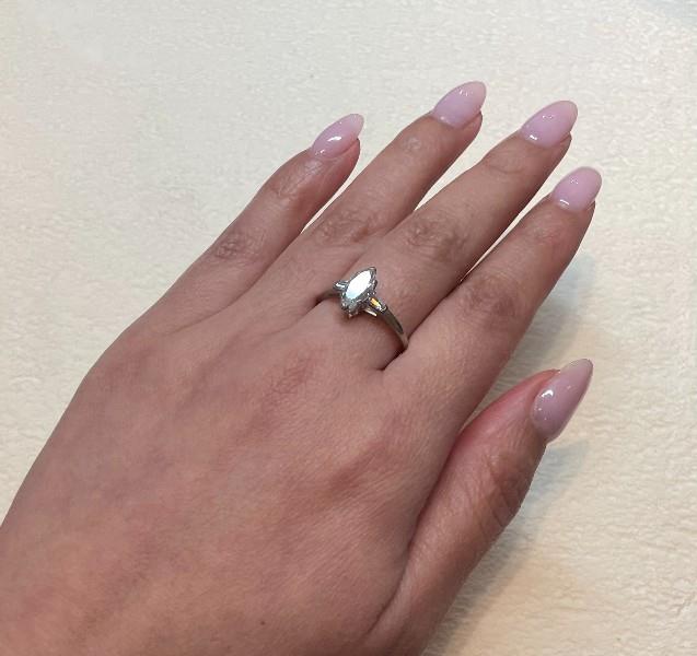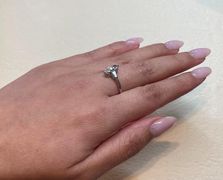 Platinum, stamped H.Bros, handcrafted as a solitaire ring, featuring a central marquise cut diamond of approximately 0.75ct, end V shaped claw set, flanked by a single tapered baguette to each shoulder, merging to fine band. Ring Size M.