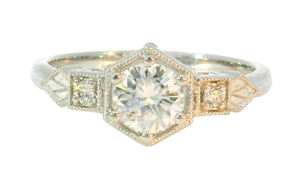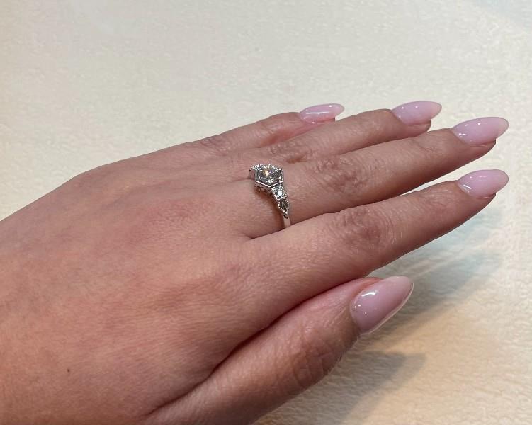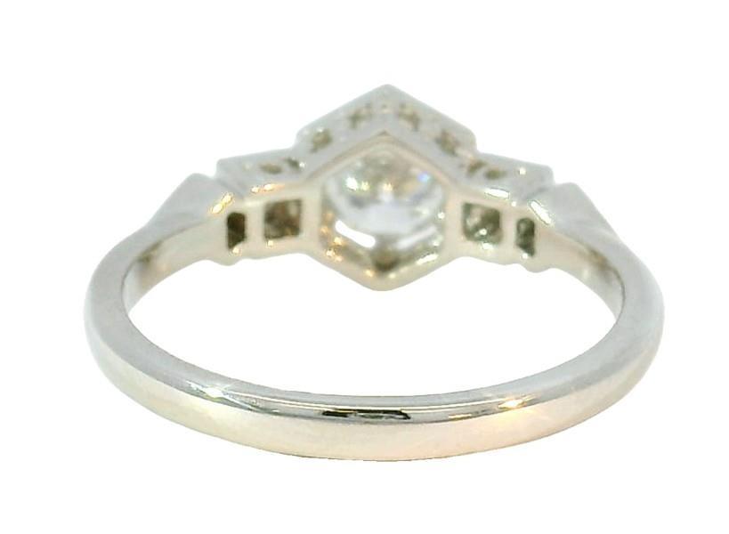 14ct white gold, featuring a centre round brilliant cut Diamond, claw set, centred by floating hexagonal frame, flanked by smaller round brilliant cut Diamonds, claw set between square frames, tapered at the ends by illusion spade shapes, millegrain detailing, pierced side profiles, merging into a polished, half round band. A.T.D.W.: 0.69ct. Ring size: O. Valuation on request, Total weight: 2.9g