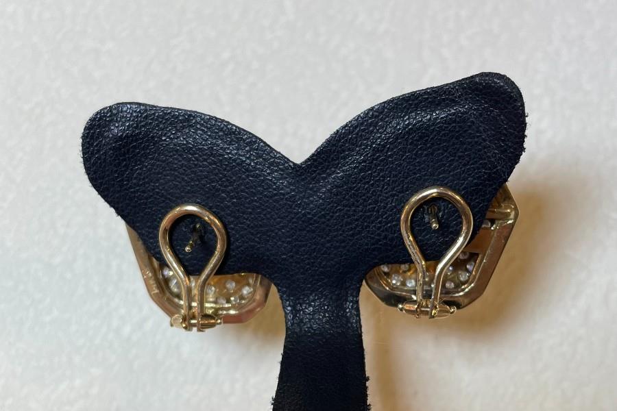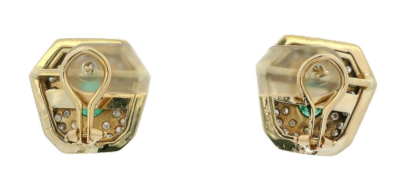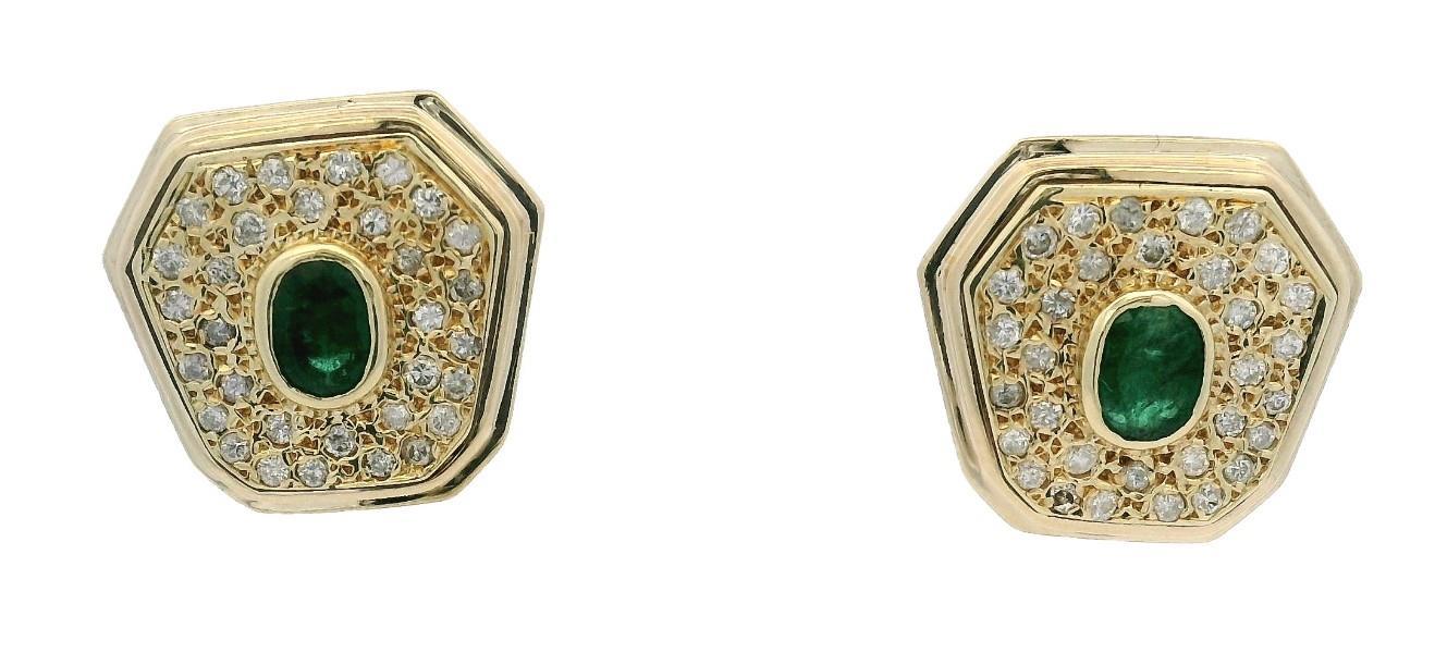 14ct yellow gold, stamped, each large stud panel earring of cut cornered shield shape, measuring 18 x 18mm at wides point, centrally detailed by a single oval emerald of medium green colour, weighing approximately 0.30ct, bezel set, surrounded by pave bead set small diamonds, edged in a ribbed stepped gold edge, fitted with pierced posts and sprung lever backs. N.B. can be converted to clip on only.