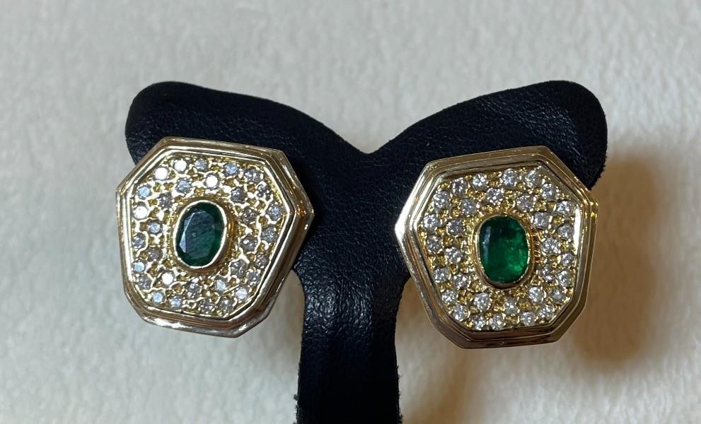 A PAIR OF 14K Y.G LARGE PLAQUE STYLED EMERALD (.30CT) & DIAMOND STUDS, WITH TOTAL WEIGHT: 11.4GRAMS