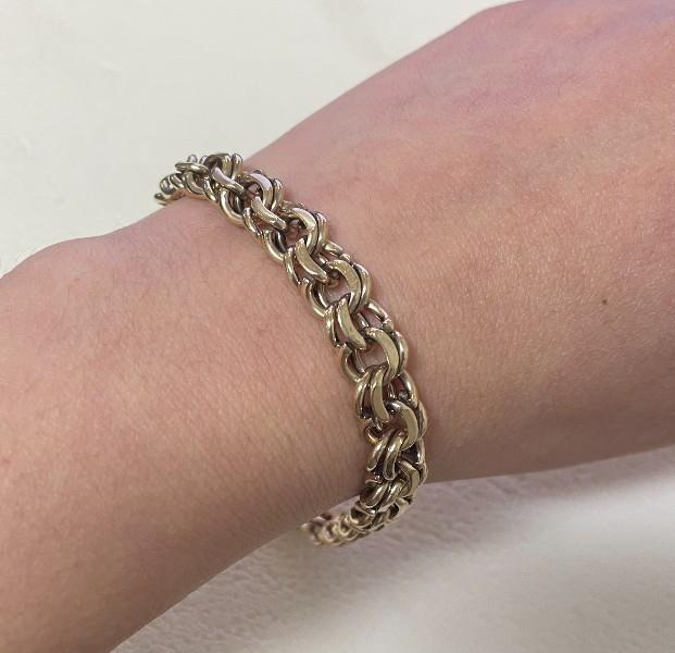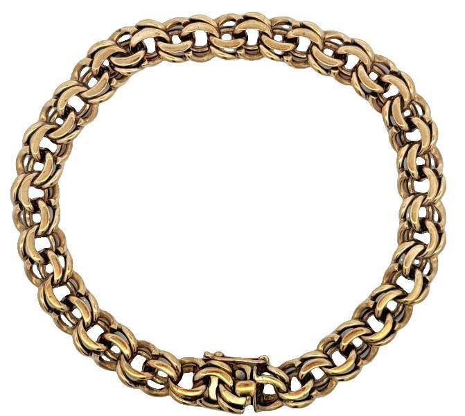 9ct yellow gold, stamped to tongue piece 9ct, of flat curb link style with double finished link, the inner of wider form and plain polished finish, edged in finer beaten link, completed with slide clasp and safety catch. Length: 22.3cms