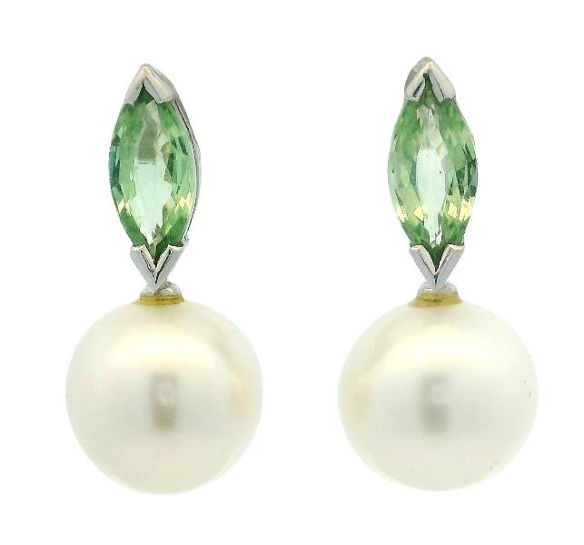 9ct white gold, fitted with 18ct white gold butterflies, of simple modern short fixed drop design, each featuring a vertically set marquise cut light bright green tsavorite garnet, end claw set in V shaped claws, supporting a single off round South Sea pearl of approximately 12mm, silver white in colour with fine lustre, completed with pierced posts. Height: 2.5cm