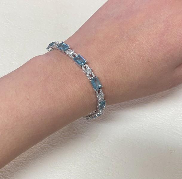 14ct white gold, featuring eleven emerald cut Aquamarines, totalling 9.89ct, medium blue, claw set, Individual basket setting, alternating between rectangular open links, lined with round brilliant cut Diamond on double rails centring each a larger round brilliant cut Diamond, totalling 2.75ct, claw set, linked through the middle in a semi flexible bracelet measuring 18.5cm long, complete with concealed clasp, secure with double side latches. Valuation on request. Total weight: 16.4g