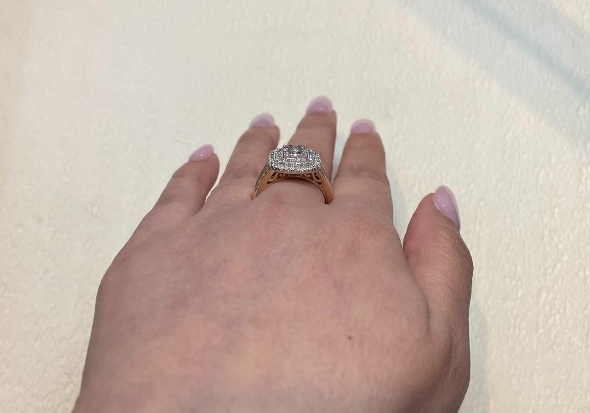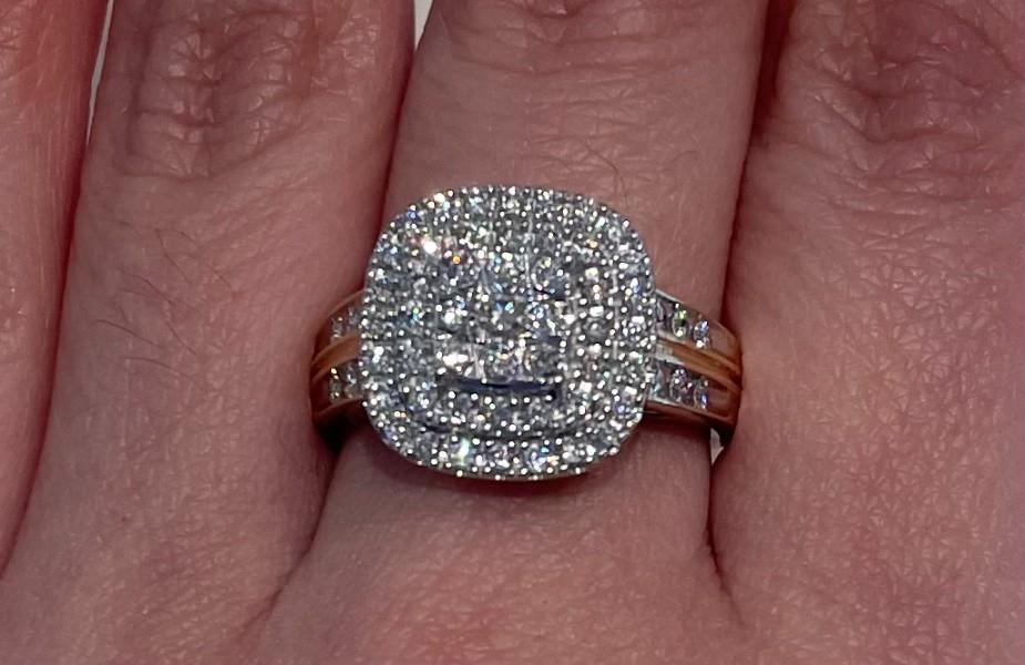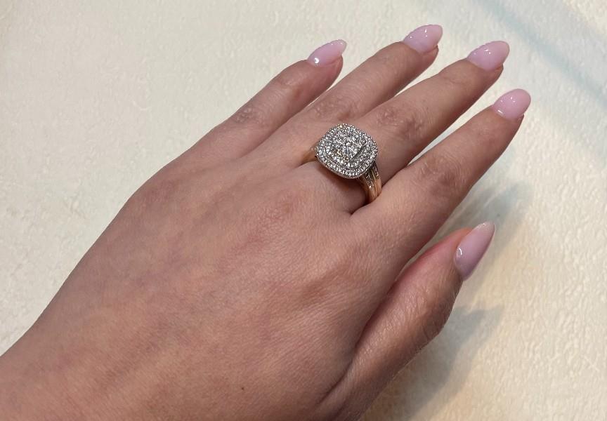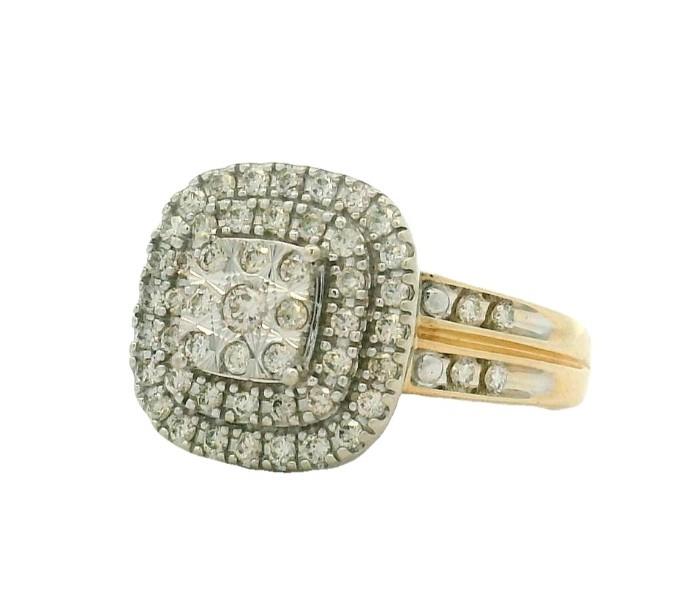 9ct yellow gold with rhodium plating to diamond set section, presented as a double cluster styled dress ring of square cushion shape, centrally featuring nine brilliant cut diamonds illusion set in a raised panel, stepping down to two bead claw set frames of smaller diamonds, completed on double diamond set band tapering to reverse, raised to allow a straight band to sit alongside. A.T.D.W.: 0.80ct.