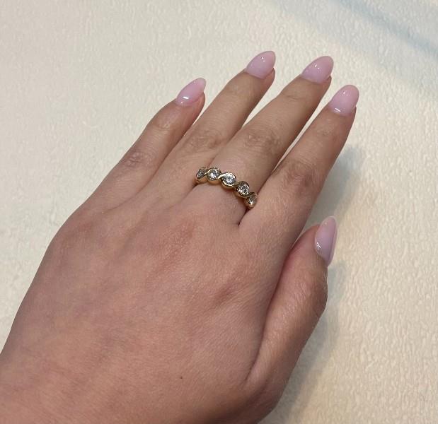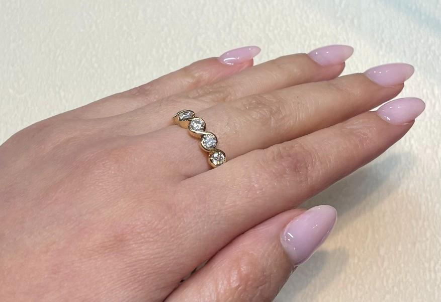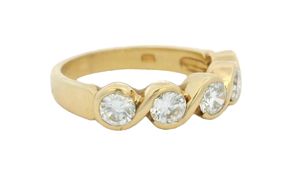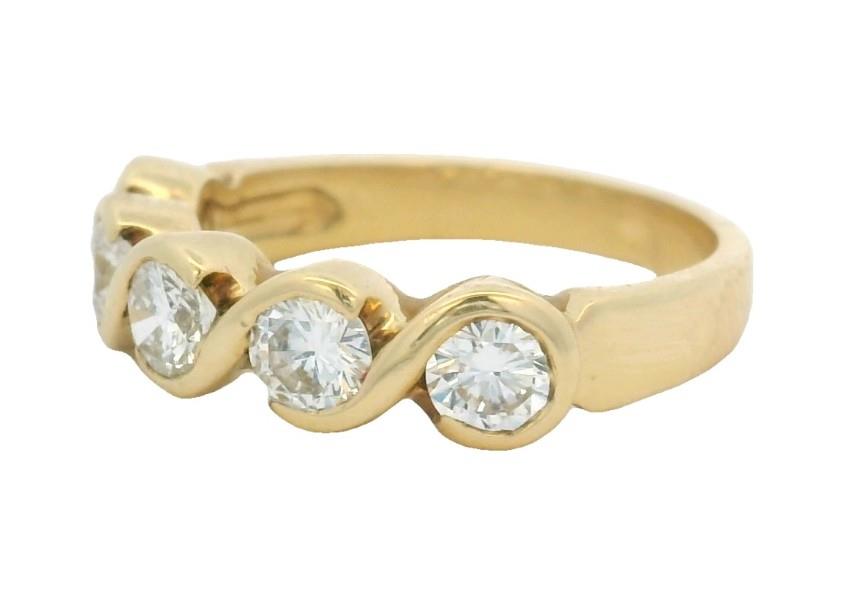18ct yellow gold, elegant and of low profile, the half hoop band ring featuring five brilliant cut diamonds of fine quality, totalling approximately 1.10ct, each in a split bezel setting, merging at sides to a plain band. Ring Size L.