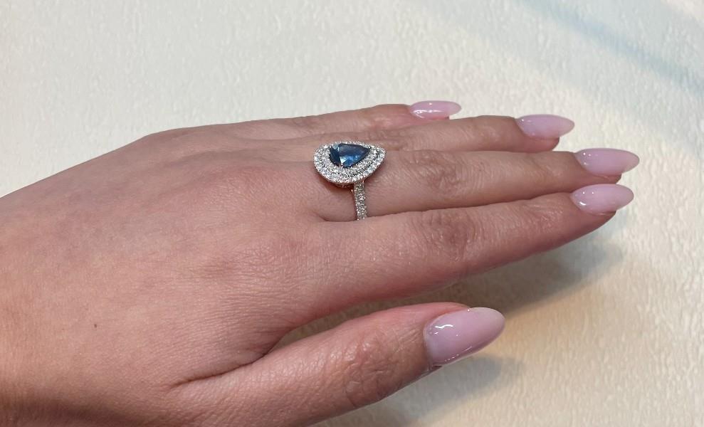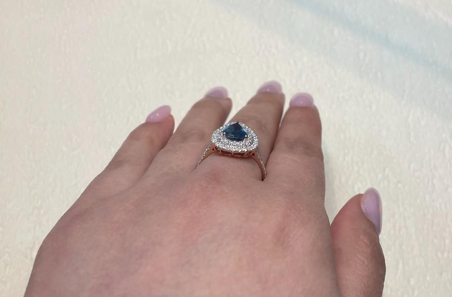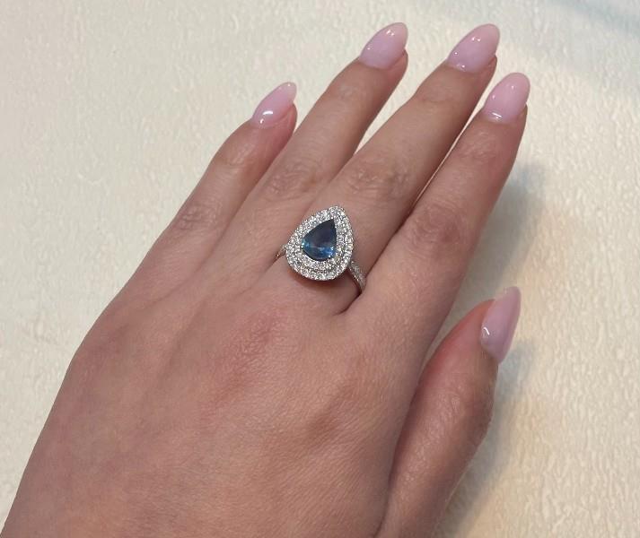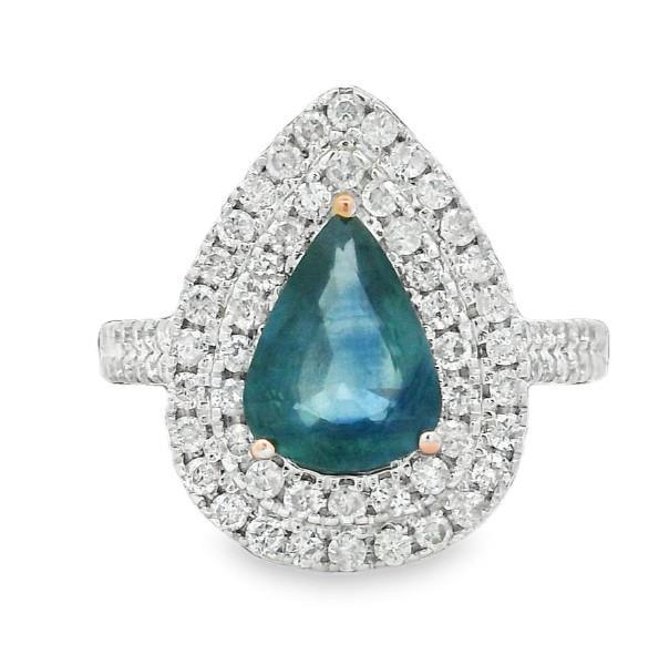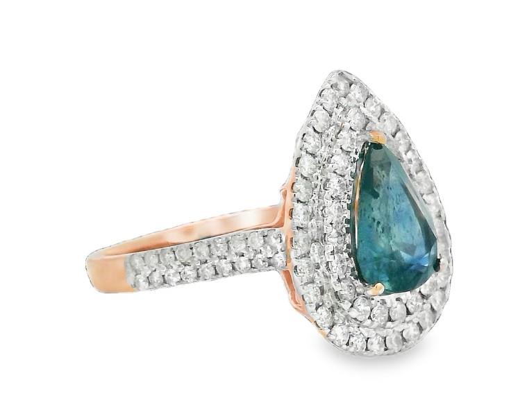 A 14K ROSE GOLD PEAR CUT SAPPHIRE OF 1.49CT & DOUBLE DIAMOND (.63CT) HALO RING, SIZE: M, T.W.: 3.1GR