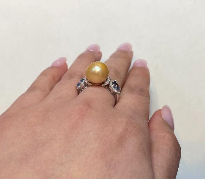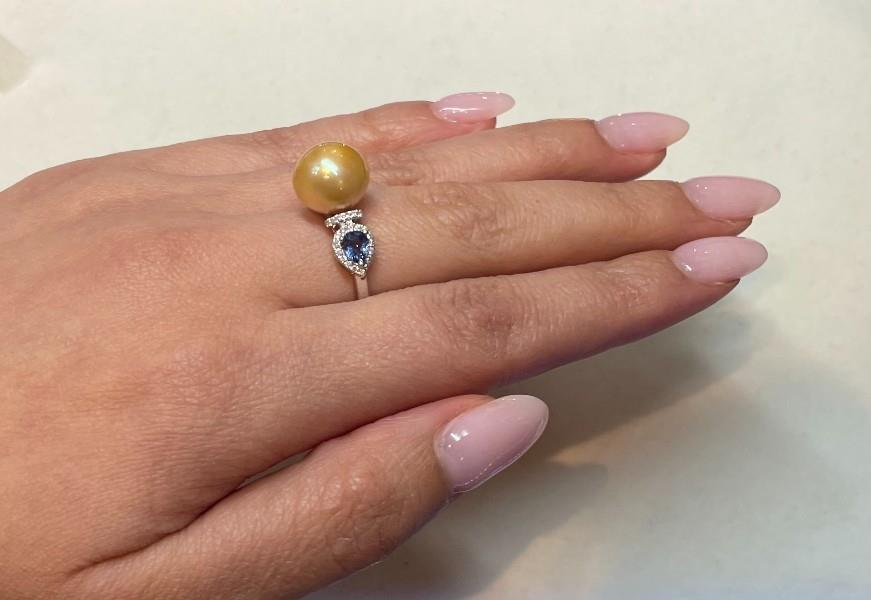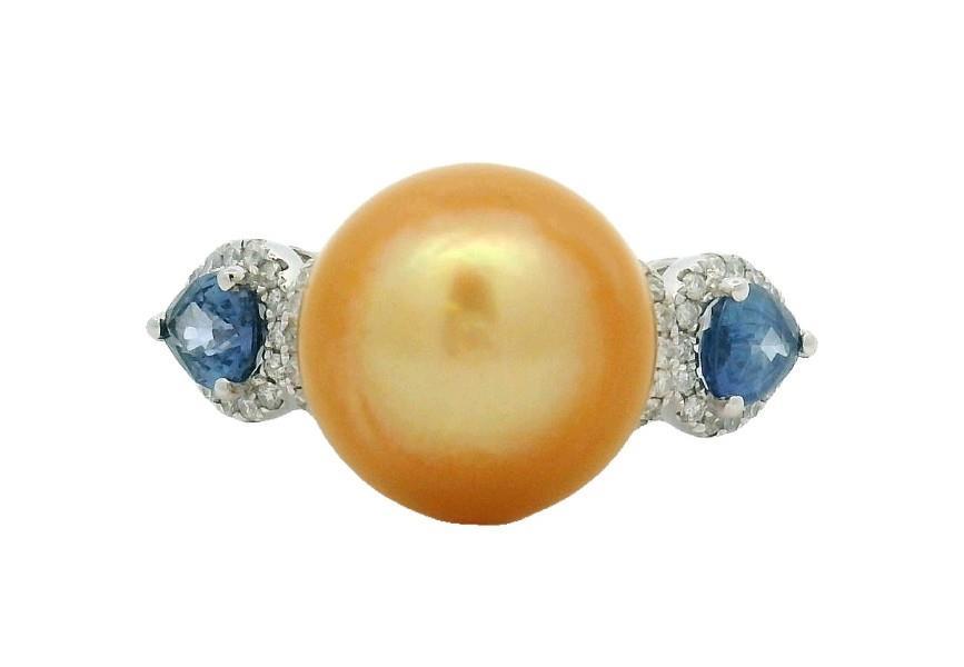 14ct white gold, featuring a centre wide round Pearl, yellow with golden overtones, nice lustre, flanked by round brilliant cut Diamond set half loops, flanked by two pear cut Sapphires, translucent medium purple blue, totalling 0.84ct, each surrounded by a halo set with round brilliant cut Diamonds, merging into a modern square band. A.T.D.W.: 0.19ct. Ring size: L. Valuation on request. Total weight: 4.4g