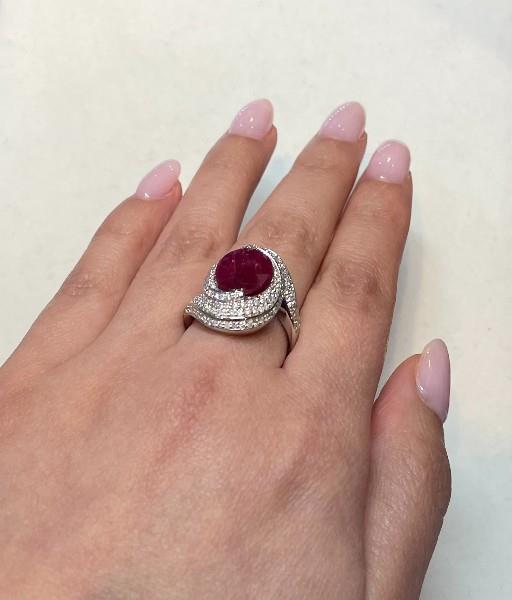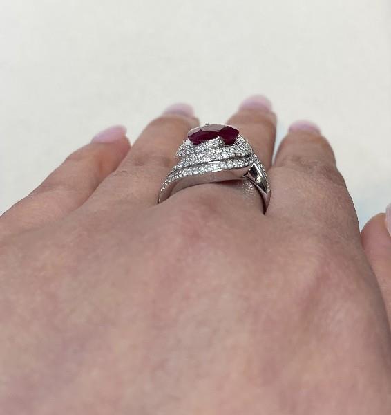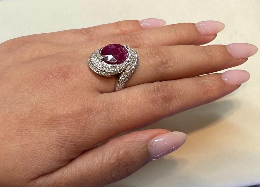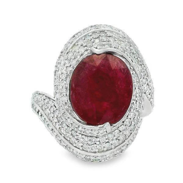 14ct white gold, featuring an oval cut Ruby, totalling 4.02ct, medium to dark red, partial bezel set by a swirl halo with slight overlay, lined by three rows within, set with round brilliant cut Diamonds, extending to the offset shoulders, totalling 0.87ct, claw set, creating a dome profile, merging into a polished flat band. Ring size: N. Valuation on request. Total weight: 6.6g