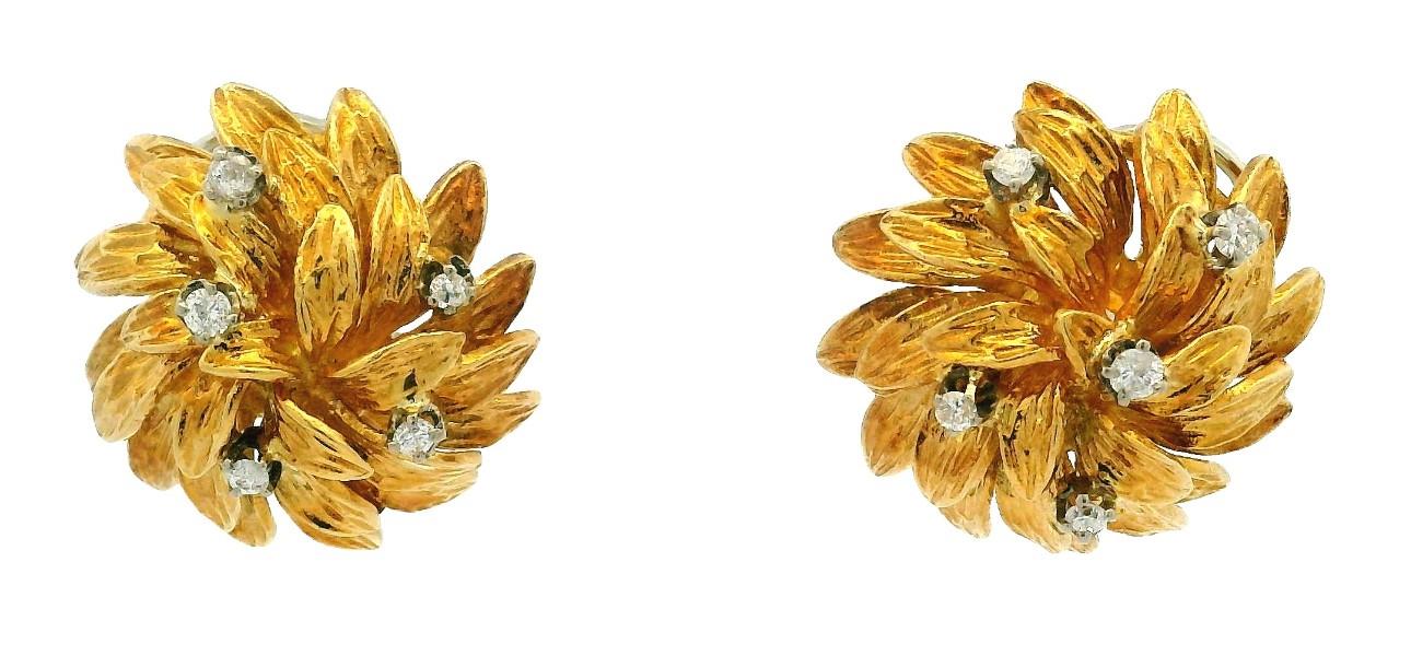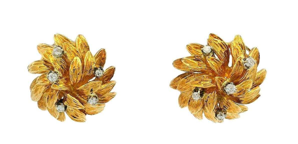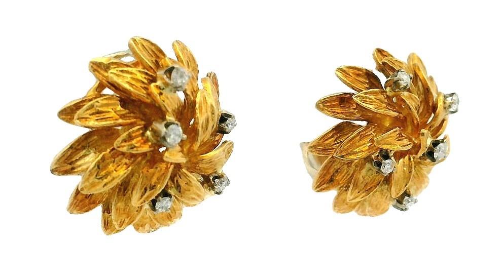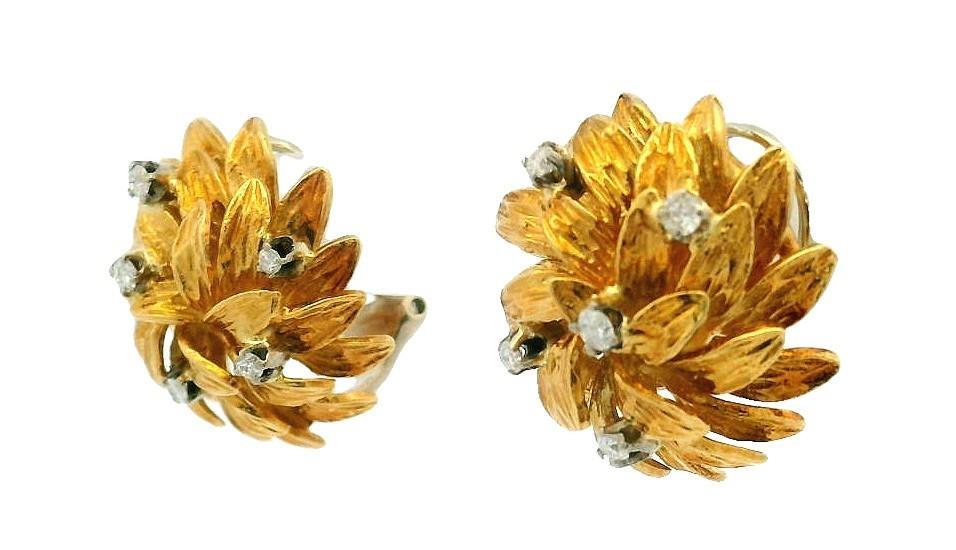 18ct yellow gold, Circa: 1960's, in the style of Kutchinsky, presented as domed round panel style studs with finely etched and polished radiating leaves of gold, each following a swirled formation, further embellished by individually claw set single diamonds, ten in total, completed with pierced posts and sprung clip backs. Diameter: 1.8cm Total Weight: 12.6grams