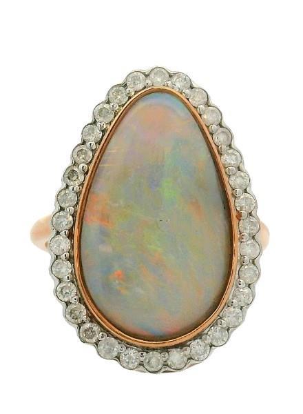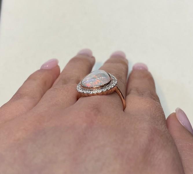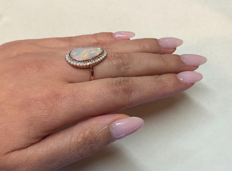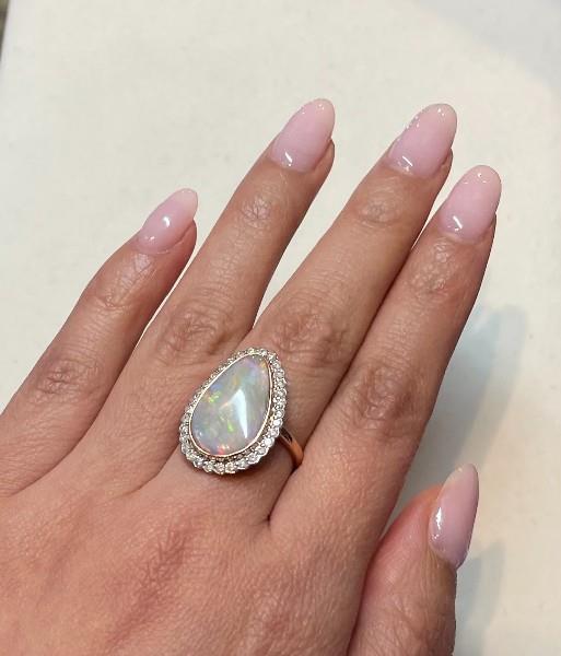 14ct rose gold and rhodium plating, featuring a solid white pear shape Opal, cabochon cut, totalling 3.44ct, grey white base with play of colour, flashing green, blue, purple and yellow, bezel set, surrounded by thirty-two round brilliant cut Diamonds, totalling 0.47ct, shared bead set, scallop edges, scallop ripples design over the profile, merging into a simple half round band. Ring size: L. Valuation on request. Total weight: 4.2g
