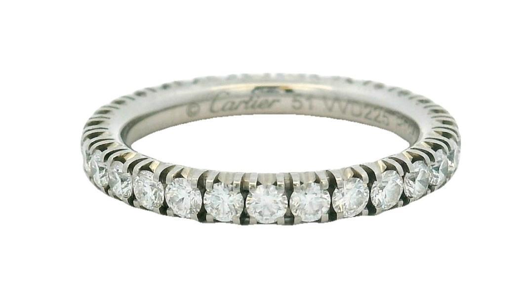 A PLATINUM CARTIER ETERNITY BAND TOTALLING 0.22CT, RING SIZE: L, BOXED WITH PROOF OF PURCHASE