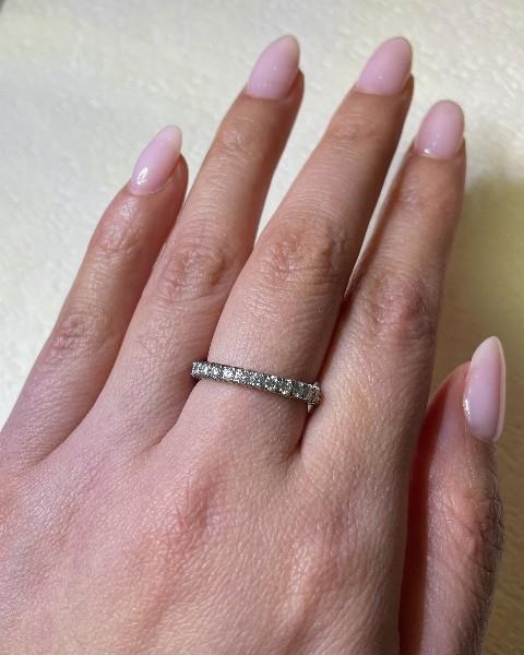 Platinum, Cartier made and stamped, exquisitely set with approximately forty-eight round brilliant cut Diamonds, totalling approximately 0.22ct, claw set to mount, smooth polished underside. Boxed with proof of purchase. Ring size: L. Total weight: 3.4g