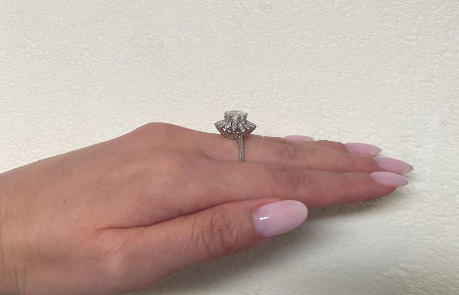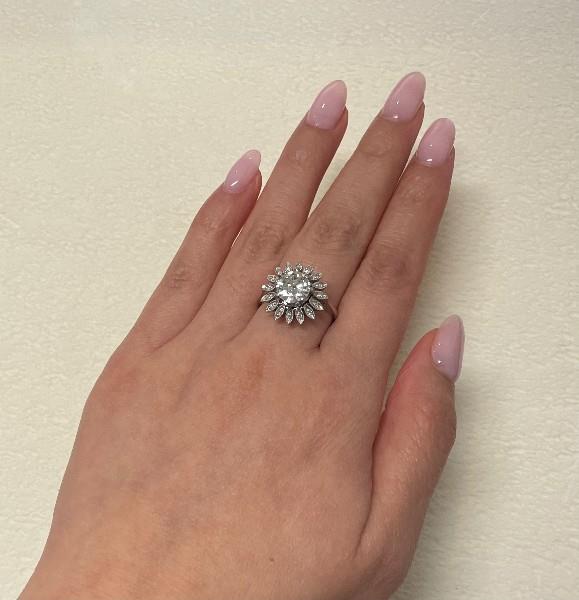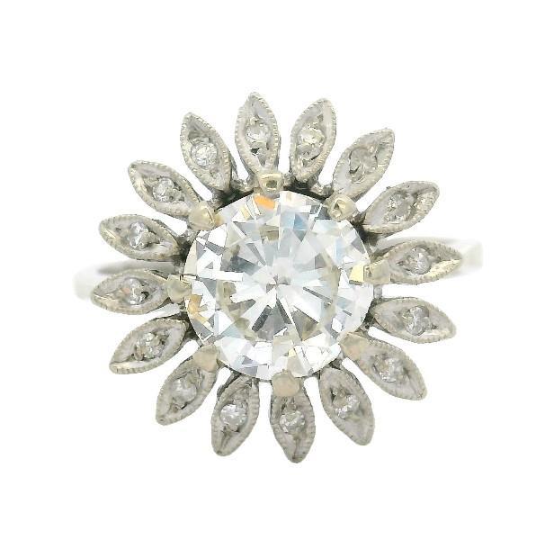 18ct white gold, made as a stylised flower, featuring a central brilliant cut diamond of approximately 1.45ct, bead claw set within a radiating frame of leaf shaped panels, each single cut diamond set, millgrained to edges, finished on a fine upswept band. Ring Size N1/2. Valuation on request.