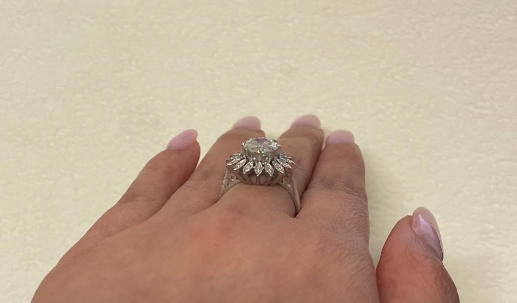 AN 18K WHITE GOLD VINTAGE DIAMOND OF 1.45CT & DIAMOND CLUSTER SET DRESS RING, SIZE: N1/2