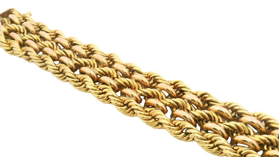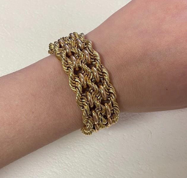 AN 18K Y.G VINTAGE WIDE YELLOW & ROSE GOLD WOVEN LINK BRACELET, WEIGHING 38.8GRAMS, 19CM LONG