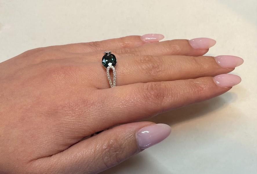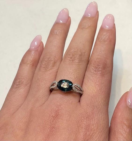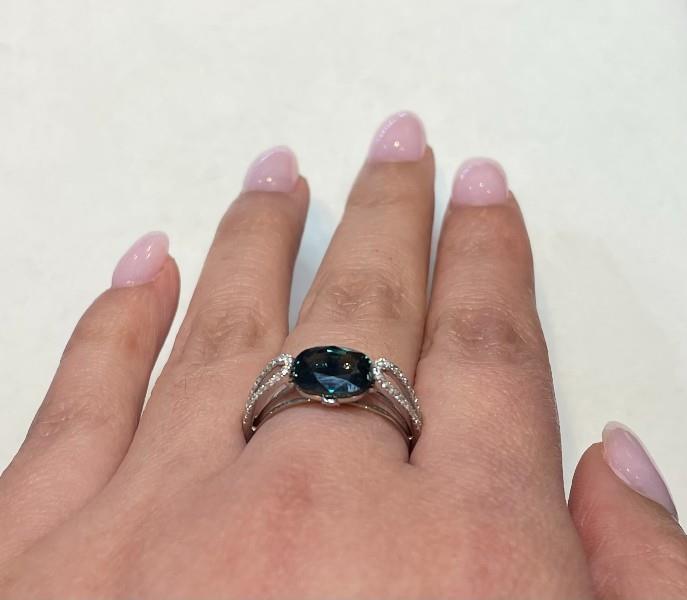 A 14K W.G MODERN SIDE SET TEAL BLUE SAPPHIRE OF 2.58CT & DIAMOND (.17CT) DETAILED RING, SIZE: Q
