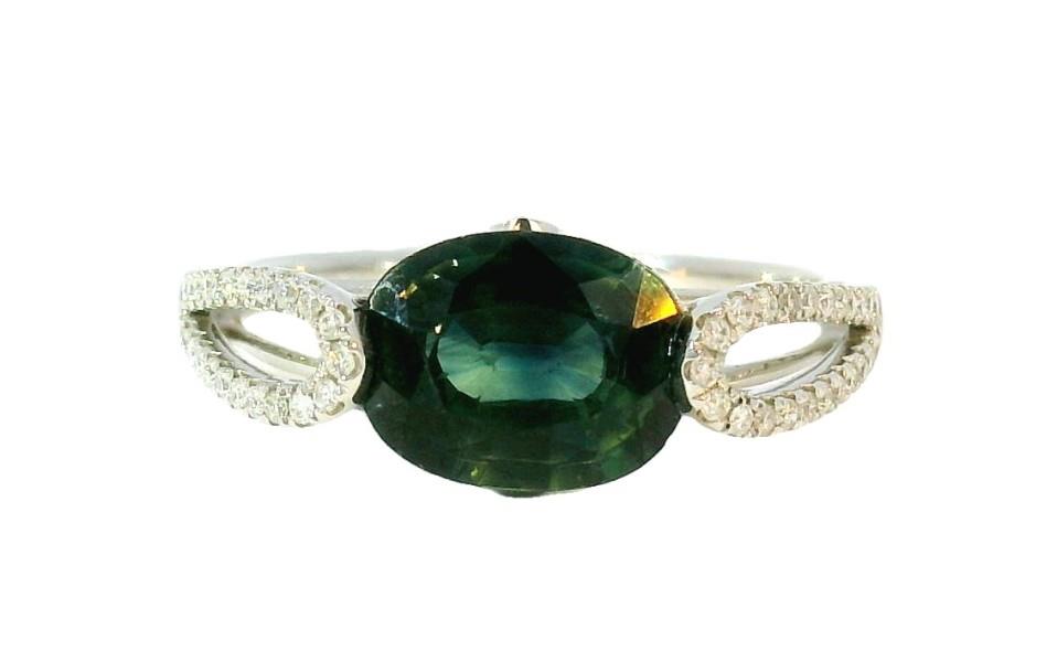 14ct white gold, featuring a side set Sapphire, totalling 2.58ct, transparent dark teal blue, tension set, Diamond detailed underbasket, held by open frame paddles, set with fifty round brilliant cut Diamonds, totalling 0.17ct, merging into a polished half round band. Ring size: O. Valuation on request. Total Weight: 2.3g