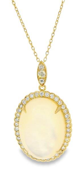 14ct yellow gold, featuring a large oval cabochon Mother of Pearl, totalling 20.04ct, claw set, good lustre, silvery white, surrounded by a halo of forty-one round brilliant cut Diamonds, claw set, scallop edge, presented with a marquise shape bail, set with three round brilliant cut Diamonds, on belcher link chain with adjustable lengths between 45 and 50cms. A.T.D.W.: 0.56ct. Height of pendant with bail: 3.2cm. Valuation on request. Total weight: 7.6g