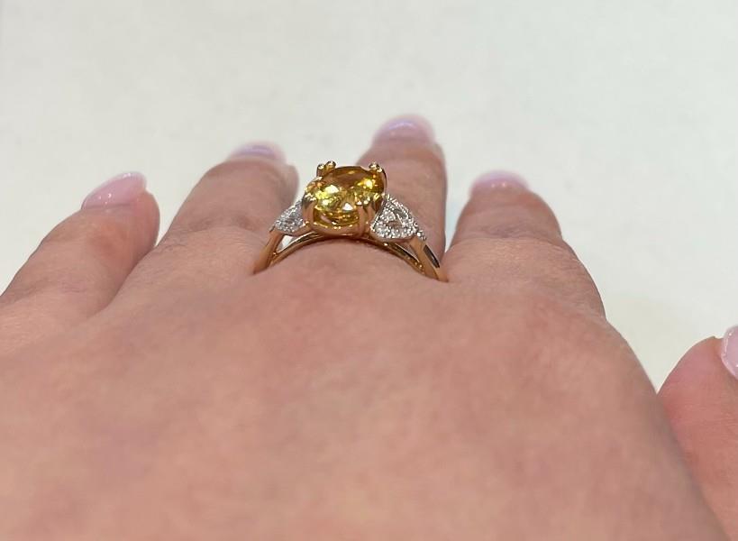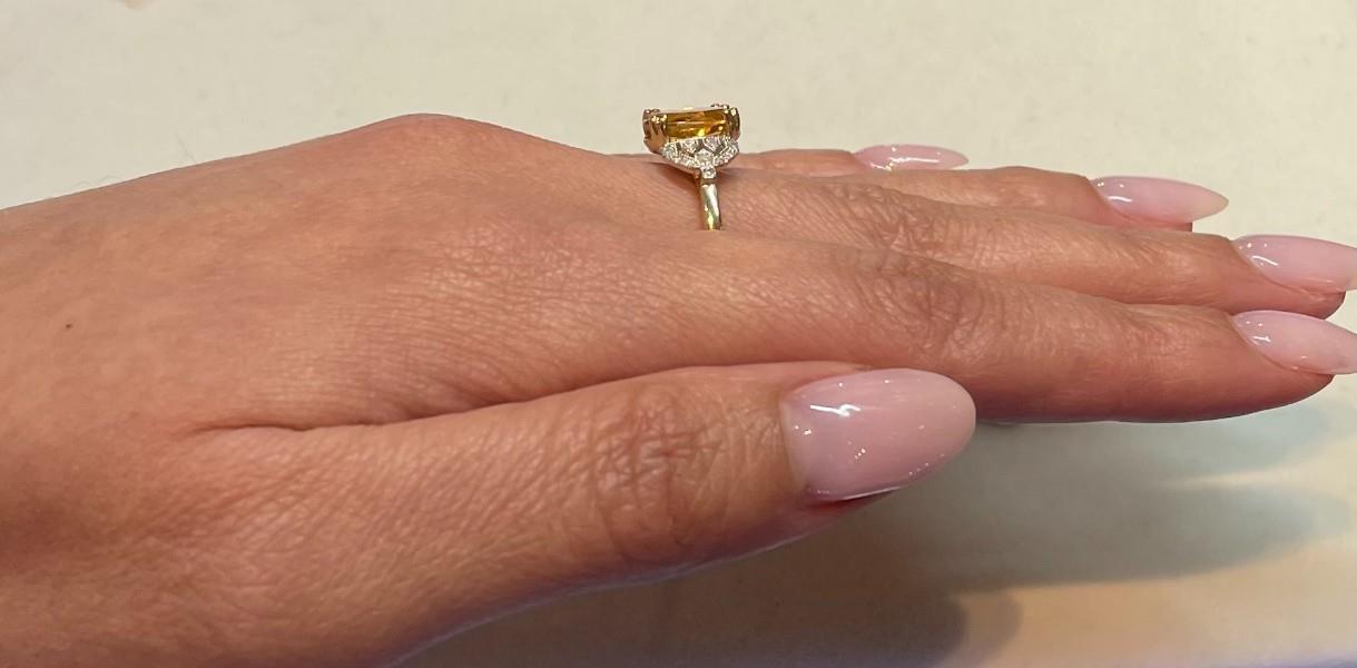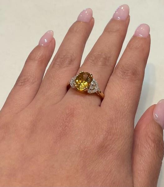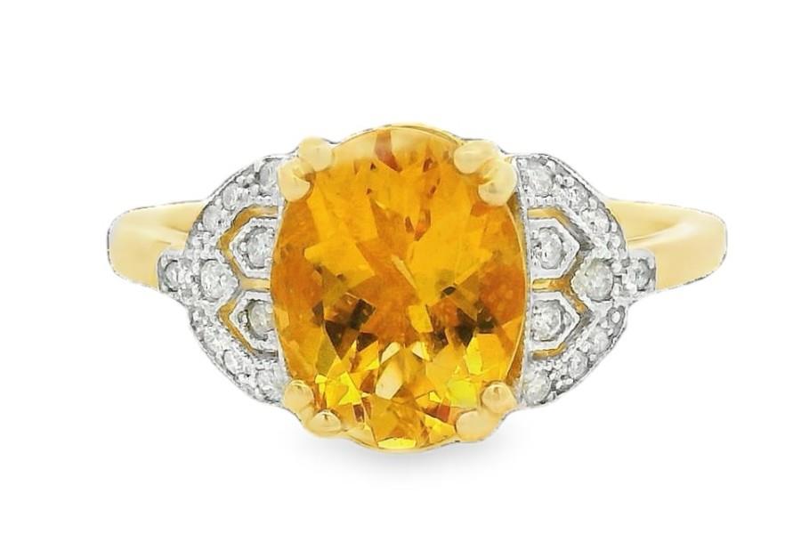14ct yellow and white gold, featuring an oval cut Heliodor, totalling 2.06ct, medium to deep golden tones, double claw set, flanked by antique inspired floating shapes, set with multi size round brilliant cut Diamonds, totalling 0.12ct, millgrain detailing, arched underbridge, merging into a half round band. Ring size: N1/2. Valuation on request. Total Weight: 3.6g