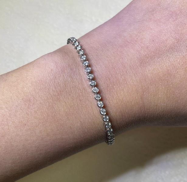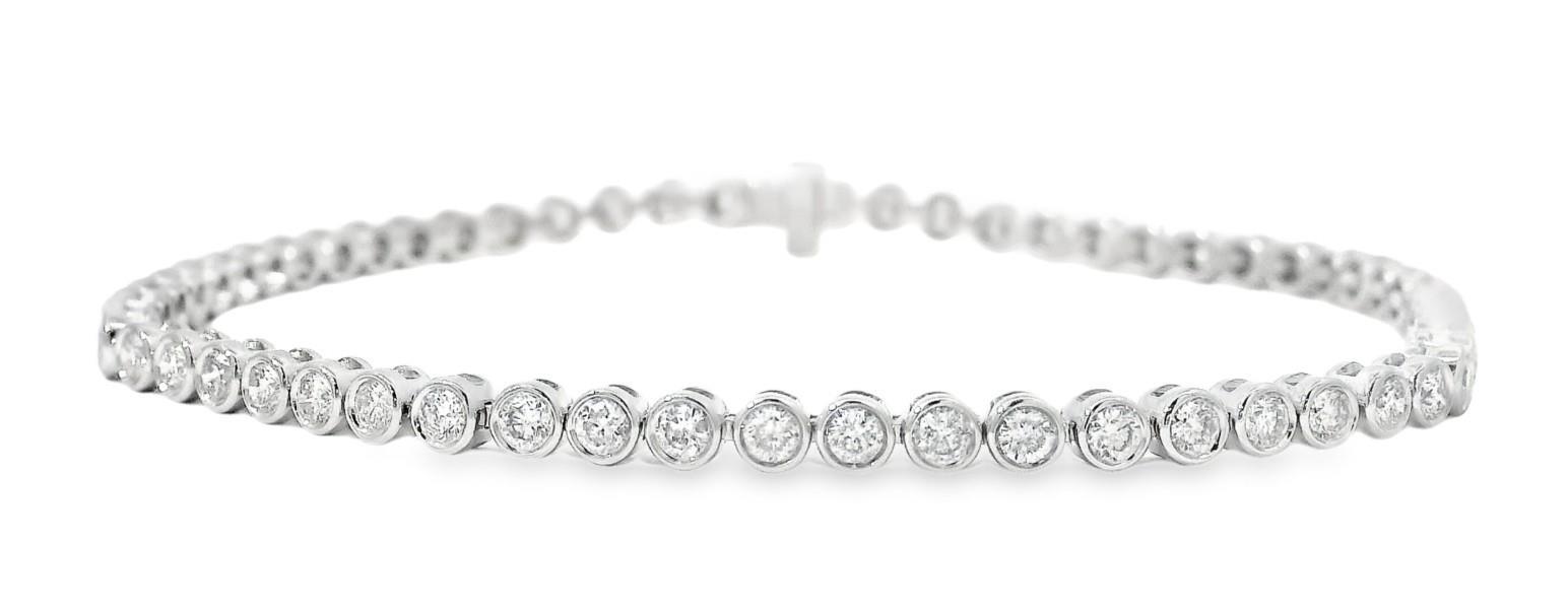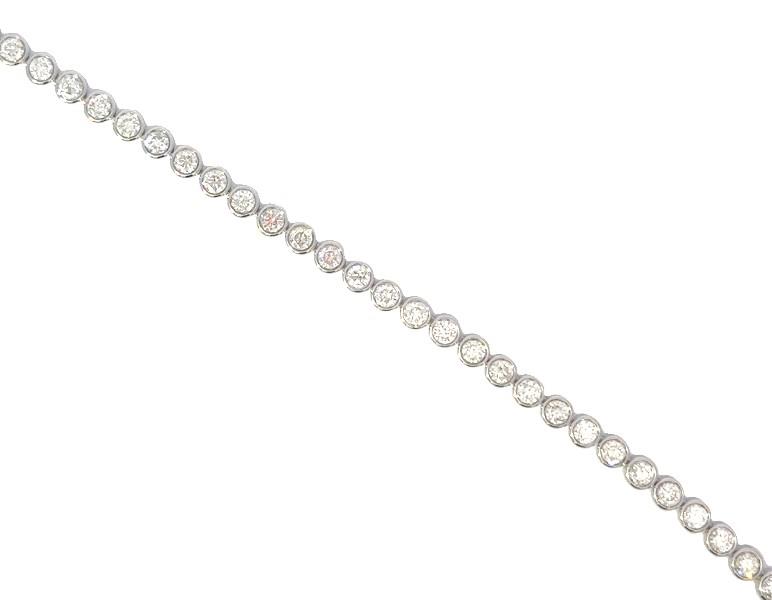 14ct white gold, featuring fifty-nine round brilliant cut Diamonds, totalling 2.03ct, bezel set, individual basket set, open backs, linked through the middle in a semi flexible bracelet measuring 18cm long, complete with concealed box clasp with under latch. Valuation on request. Total weight: 7.3g