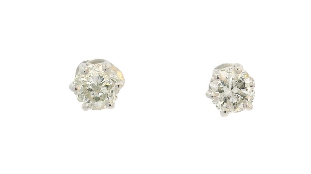 18ct white gold, featuring a pair of round brilliant cut Diamonds, totalling 2.08ct, multi claw set, basket setting, presented with pierced post with butterfly backings. Diameter of studs: 0.6mm. Valuation on request. Total weight: 2.2g