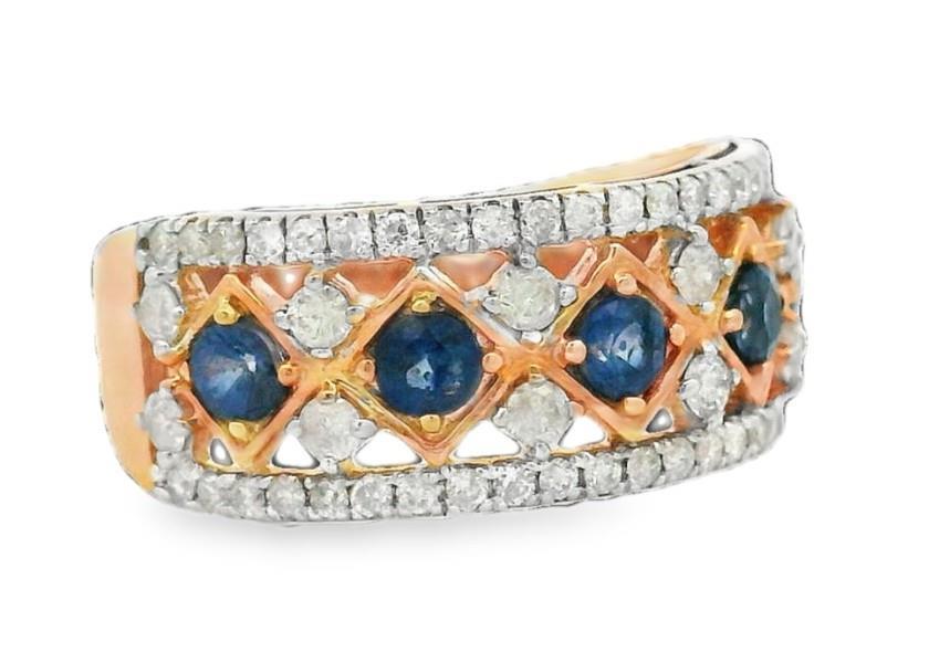 A 14K ROSE/WHITE GOLD SAPPHIRE (.72CT) & DIAMOND (.65CT) CLUSTER OPEN BAND RING, SIZE: M1/2