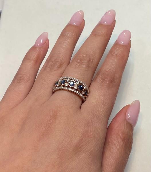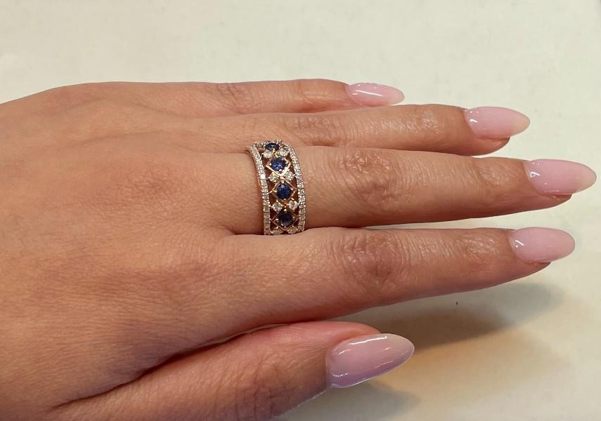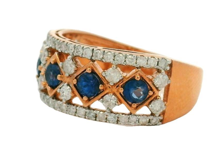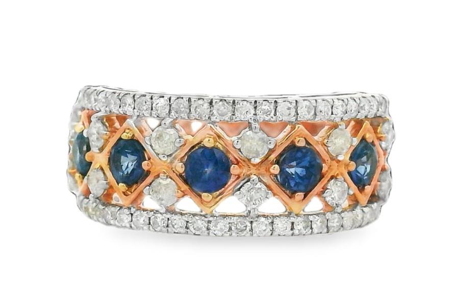 14ct rose and white gold, featuring five lined round brilliant cut Sapphires, totalling 0.72ct, individually claw set, centred by kite shape frames, accompanied by twelve round brilliant cut Diamonds, set between the gaps, claw set, lined to the outer band is a floating frame, set with smaller round brilliant cut Diamonds, merging into a polished flat band with taper at reverse. A.T.D.W.: 0.65ct. Ring size: M1/2. Valuation on request. Total Weight: 4.6g